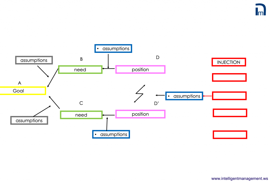 The assumptions in this framework represent conditions of sufficiency among the different categories of speech; they complete the cloud both logically and linguistically. However, the assumptions between D and D’ are different. They are not conditions of sufficiency. Instead, they represent limiting mental models—what at Intelligent Management we call the Cognitive Constraint—which we must always try to overcome to break through into a new solution.