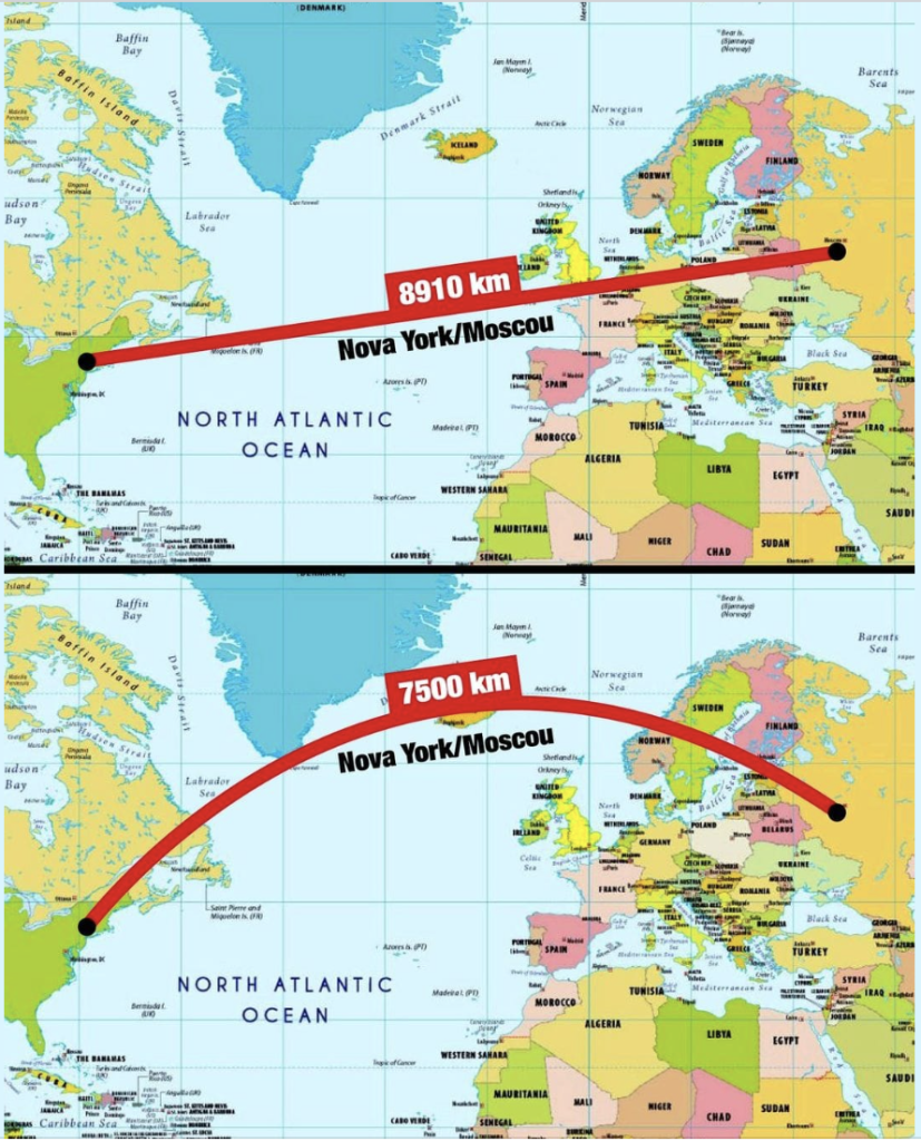 However, this assumption weakens considerably when we embark on an overseas journey. Common sense suggests that the shortest route from New York to Moscow is a straight line across the Atlantic Ocean, heading west to east (based on the assumption that the earth is flat). Yet contrary to intuition, the actual shortest route follows a curved trajectory—first heading northeast, then southeast—following the geodesic connecting the two cities on the globe.