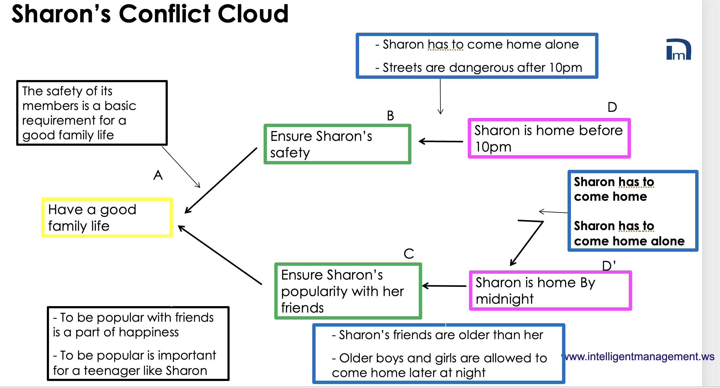 The assumptions in this framework represent conditions of sufficiency among the different categories of speech; they complete the cloud both logically and linguistically. However, the assumptions between D and D’ are different. They are not conditions of sufficiency. Instead, they represent limiting mental models—what at Intelligent Management we call the Cognitive Constraint—which we must always try to overcome to break through into a new solution.