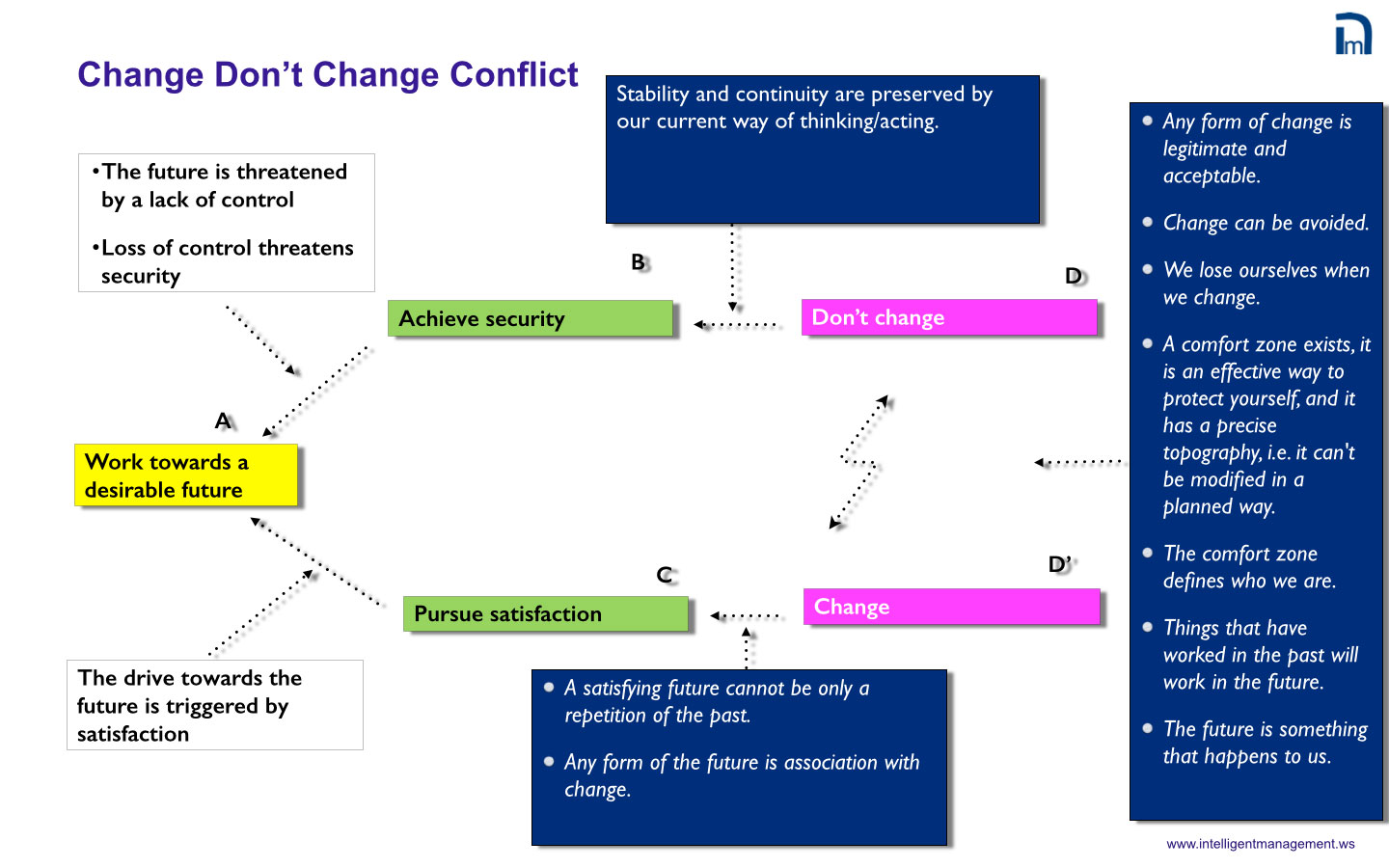 The Conflict Cloud Thinking Process from the Theory of Constraints provides a systemic approach to navigate any dilemma or situation of blockage that requires decision making. We can use an archetypal example to show how it works. In this case, it is a universal conflict of change vs. don’t change. The boxes D and D’ contain two conflicting “wants”. The box B contains the need we want to protect that pushes us in the direction of D: Don’t change. The box C contains the need we want to protect that pushes us in the direction of D’: Change. The needs in B and C are both legitimate and not in conflict. The box A contains the goal that satisfies both the needs in B and C.